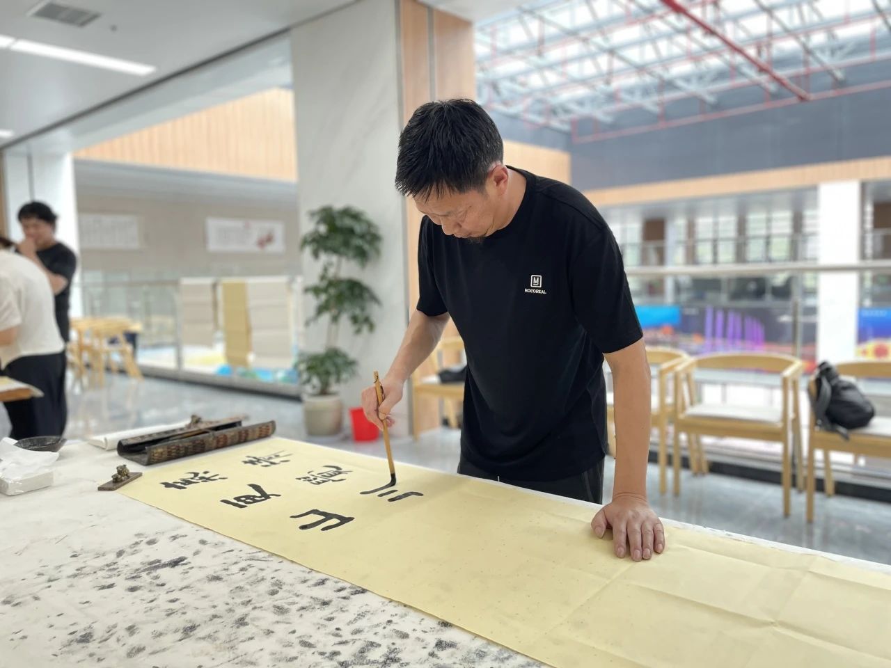 书法家们创作的过程中一起讨论交流书法中不同的运笔技巧。他们怀着对书法艺术的崇高敬意和对传统文化传承的使命感,沉浸在浓厚的艺术氛围之中。书法家们以笔会友,互相展示各自的书法作品,分享创作心得和经验。每一笔、每一划都蕴含着深厚的功力和独特的艺术感悟,让人充分领略到书法艺术的魅力。